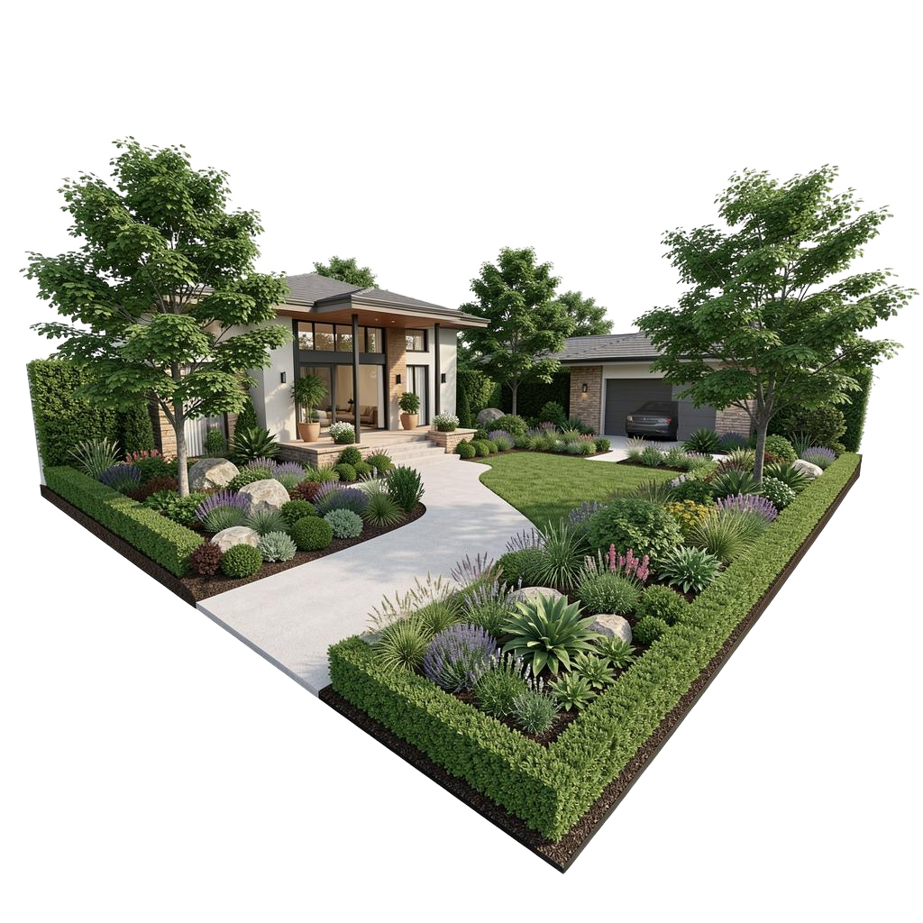 Показываем, как будет выглядеть сад после реализации. Вы видите фактуру материалов, свет, тени, зелень